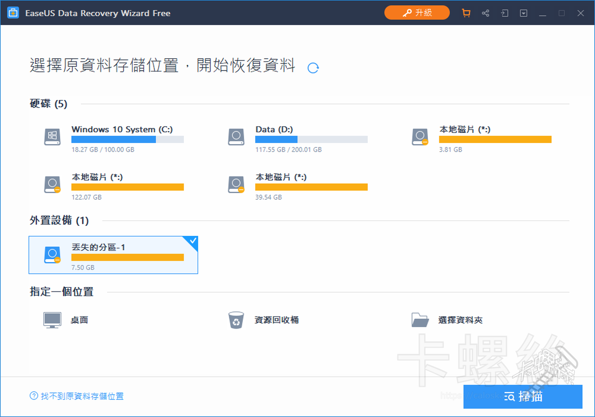 啟動後可看到電腦上的硬碟分區與外接設備,選擇要救援的儲存裝置或路徑後點選 掃描(本篇使用 USB 隨身碟進行示範)
