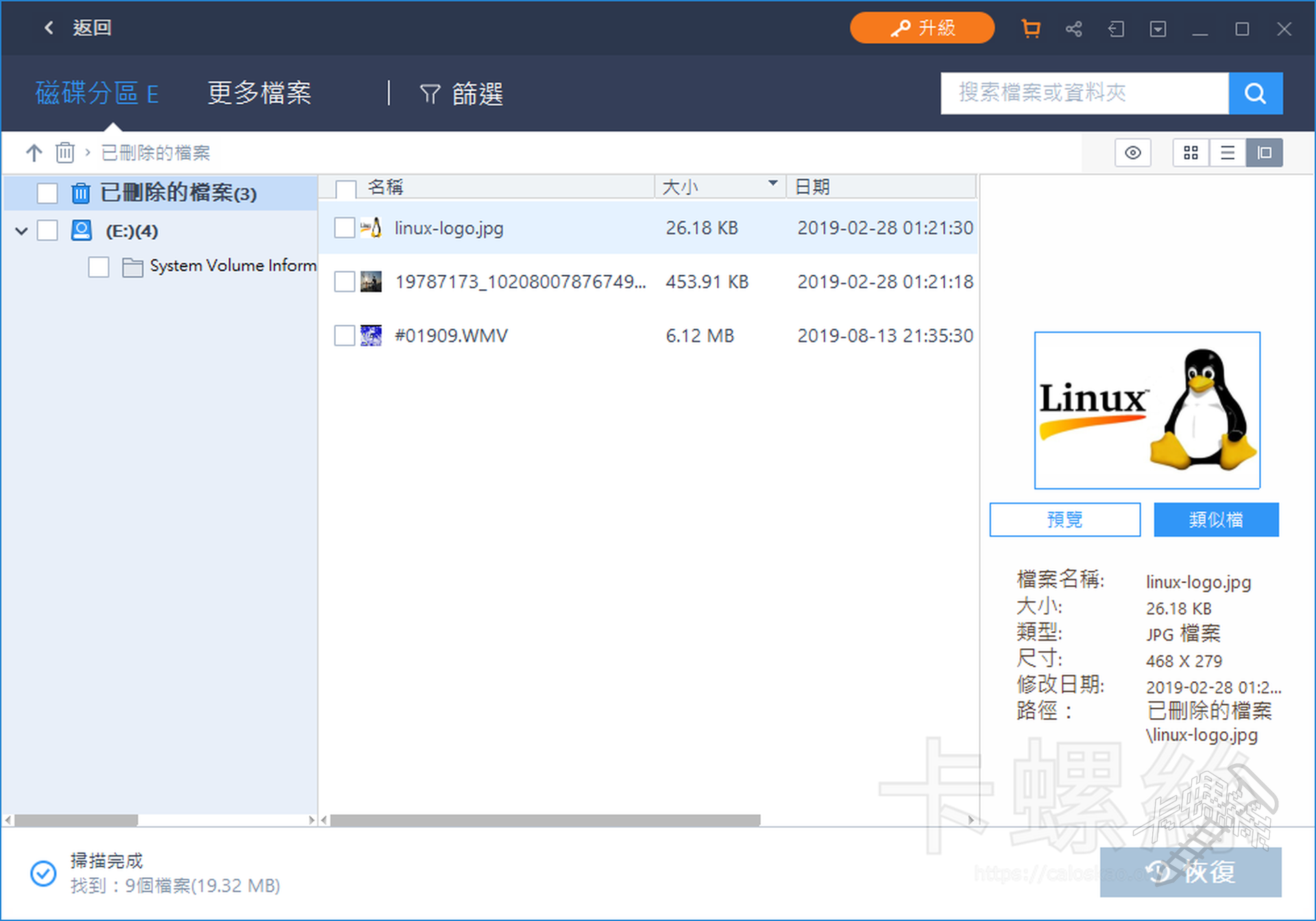 但是通常一開始最初的幾秒就會出現一些檔案,而且會顯示掃描已完成,但過沒幾秒狀態又變成繼續掃描,原因是掃描會有兩個階段,第一階段會先快速掃描表層資料,這時候被偵測出來的檔案基本上應該都還算完整,而第二階段會逐一對每一個磁碟區塊做深度掃描,有機會挖掘出更多的檔案。