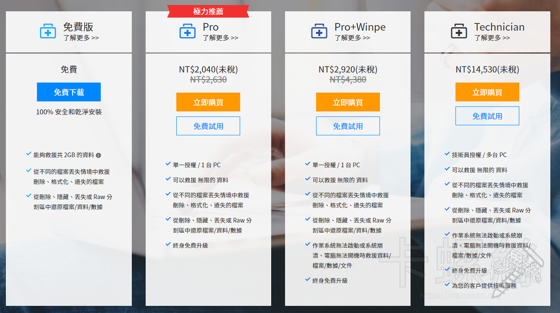 版本總共有四種,分別是 Free、Pro、Pro+Winpe、Technician 四種,主要差異是可恢復的數據量,付費版本沒有限制,而免費版的限制則是 2GB;而三種付費版的主要差異為 Pro+Winpe 支援在系統無法啟動時進行救援,Technician 版的授權數量為多台,可以用於商業用途,提供你的客戶技術上的服務。如果需要救援的資料量不大,或許免費版即可完成,如果需要恢復的資料量大,那可能就需要購買付費版本,雖然要價 2000 起,但是跟資料救援業者相比還是便宜許多。