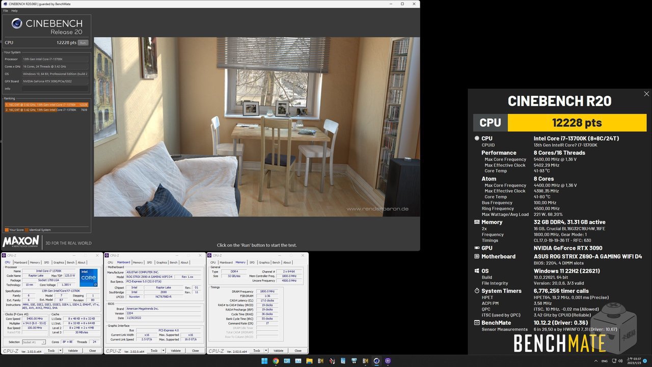Cinebench R20 多核成績得到 12228 pts,P-Core 最大溫度攝氏 93 度,最大功耗測得 221W。