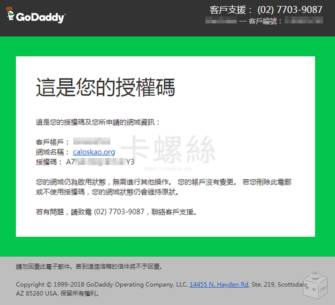 GoDaddy 寄來的域名轉出授權碼通知信大概長這樣,等一下會用到。