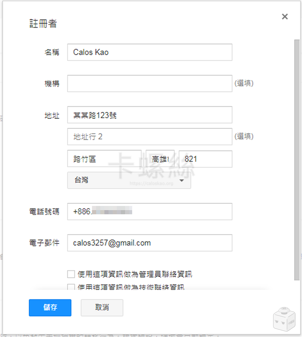 目前 Google Domain 可支援台灣中文地址,「國家」欄位選擇台灣,「城市」欄位填入鄉鎮區名,「州/省」欄位填入縣市名,就可以通過驗證了。