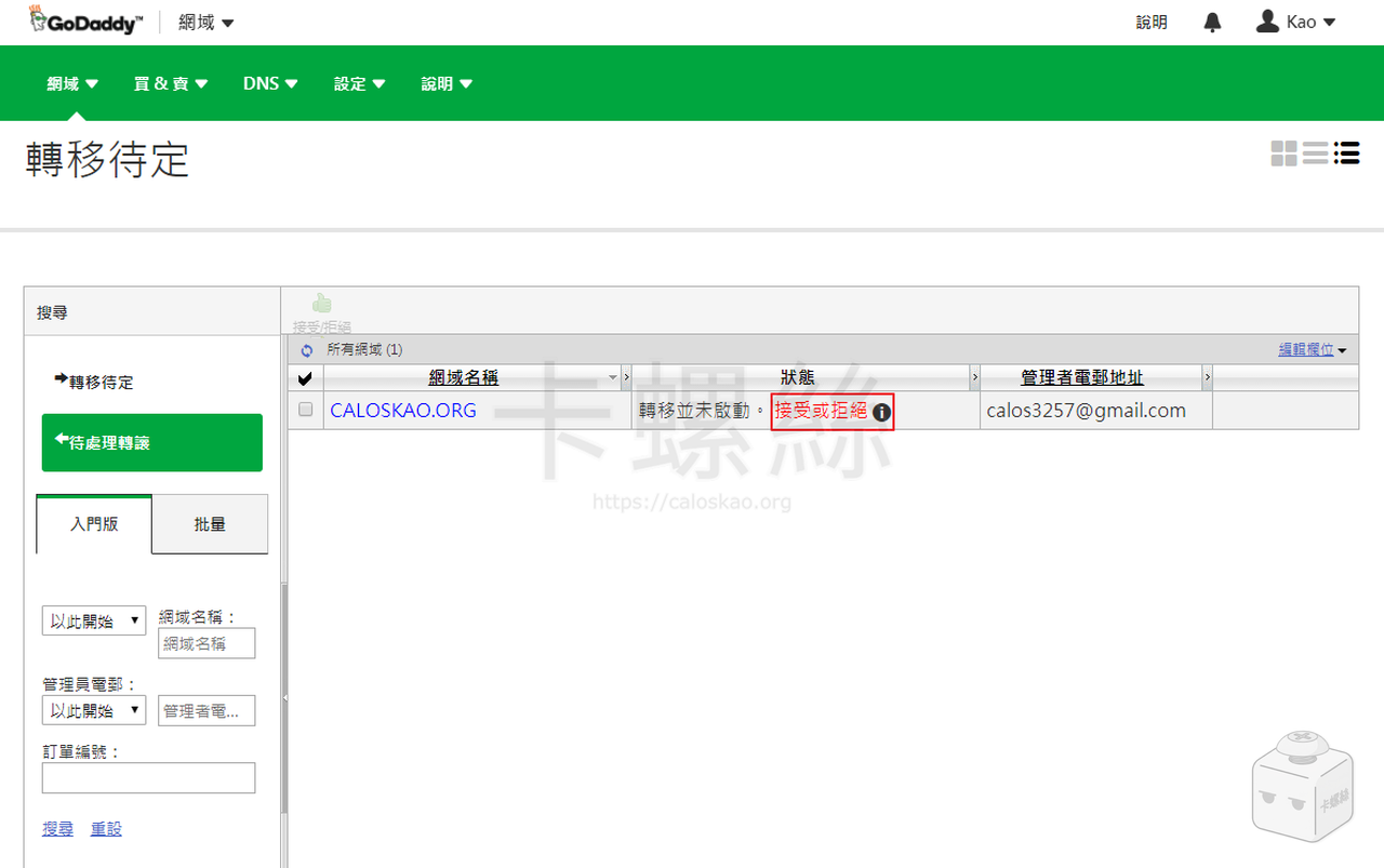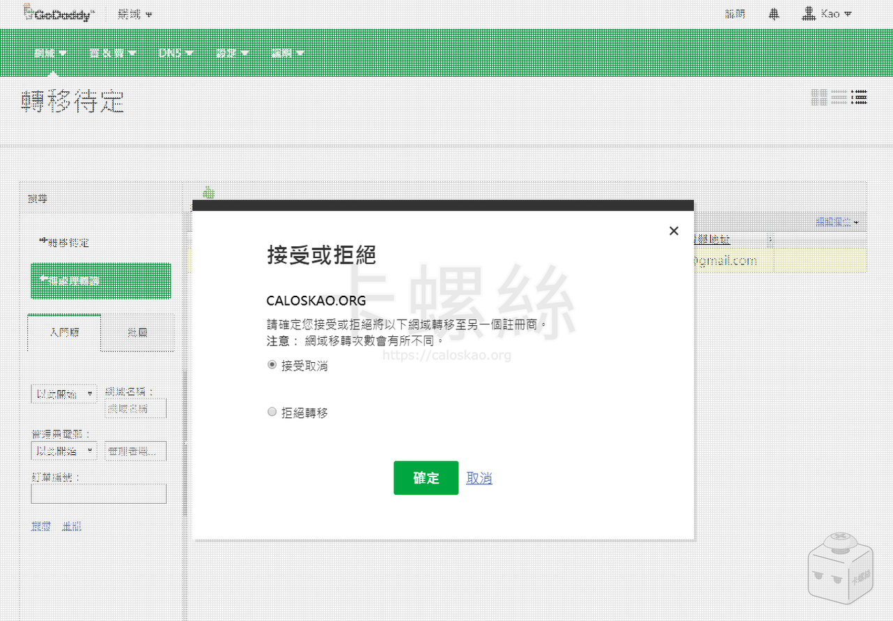 接著 GoDaddy 會再跟你做最後確認,雖然那個「接受取消」的翻譯有點混淆,但是請忽略掉「取消」兩個字,點選「確定」,就會馬上開始進行轉移。
