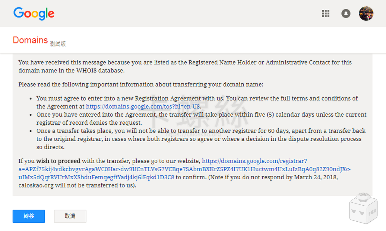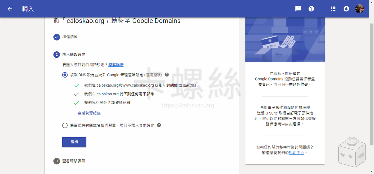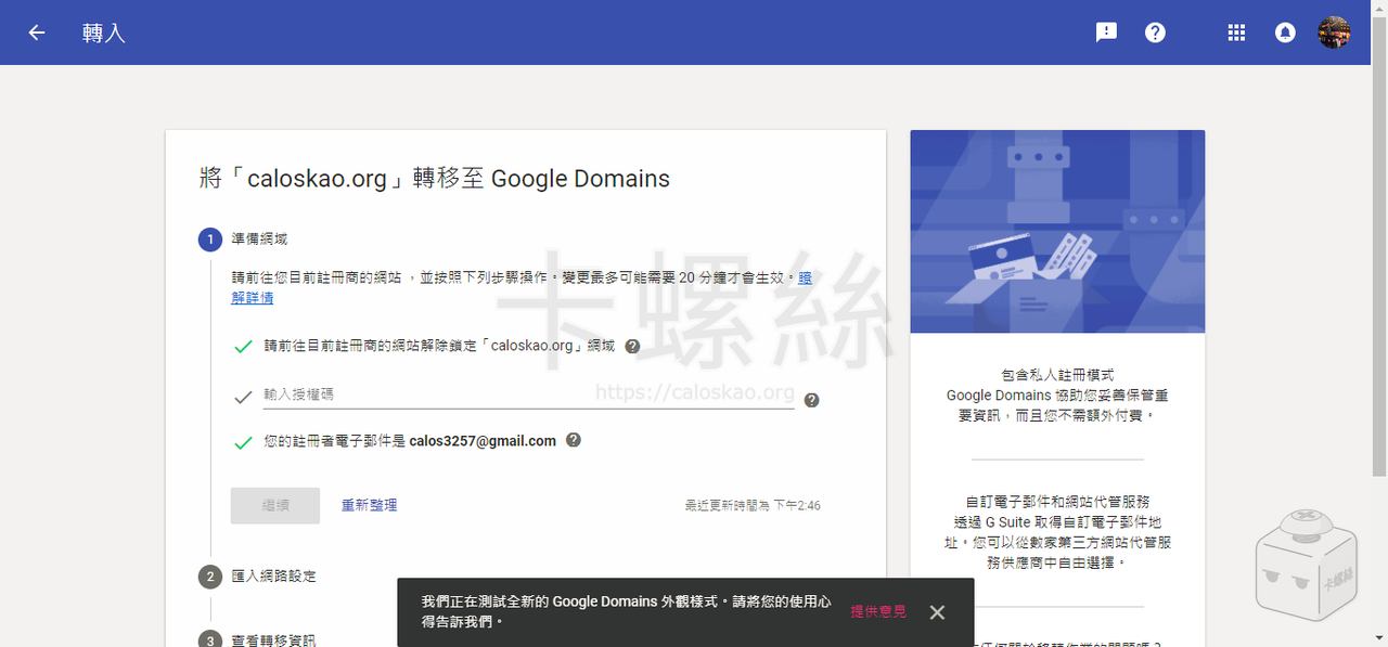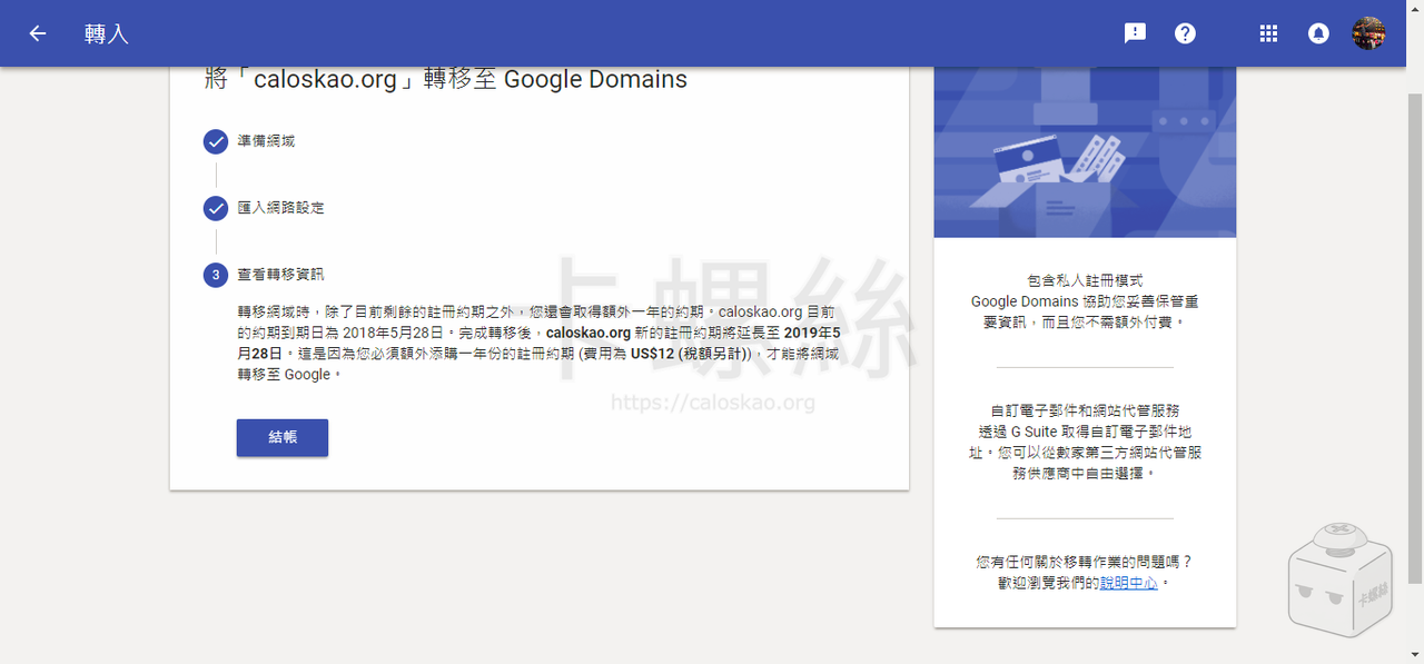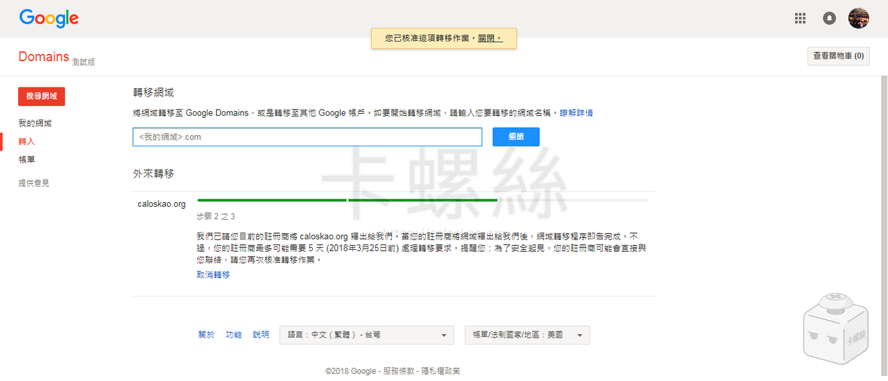到這邊 Google Domain 的操作就全部完成了,5 天之後若沒有取消轉移,網域就會正式移入 Google Domain。