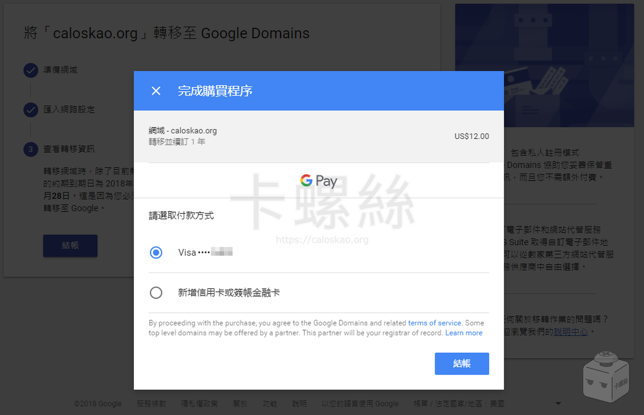 這裡 Google Domain 會提醒你要預先收取續約一年的費用,直接下一步進行結帳。