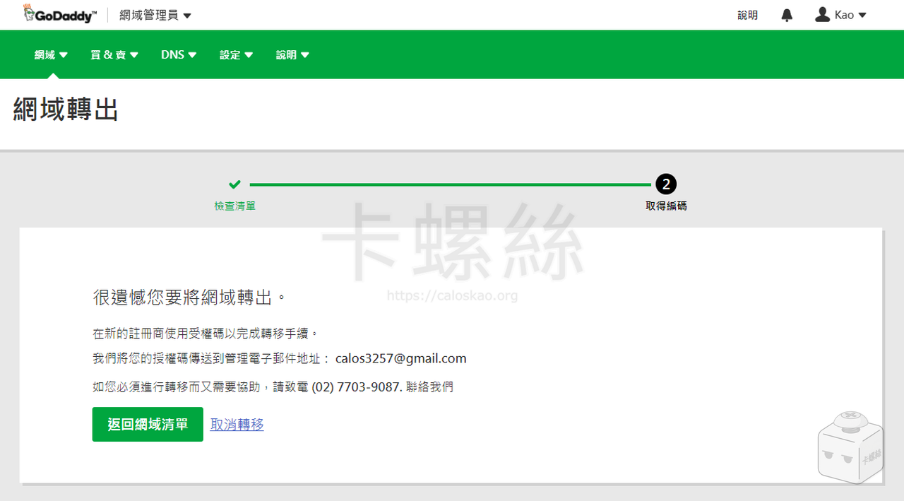 下一個畫面,GoDaddy 會列出一些注意事項,並請你填寫轉移原因,填寫完成後送出,GoDaddy 就會將網域移轉授權碼寄到你的 Email。