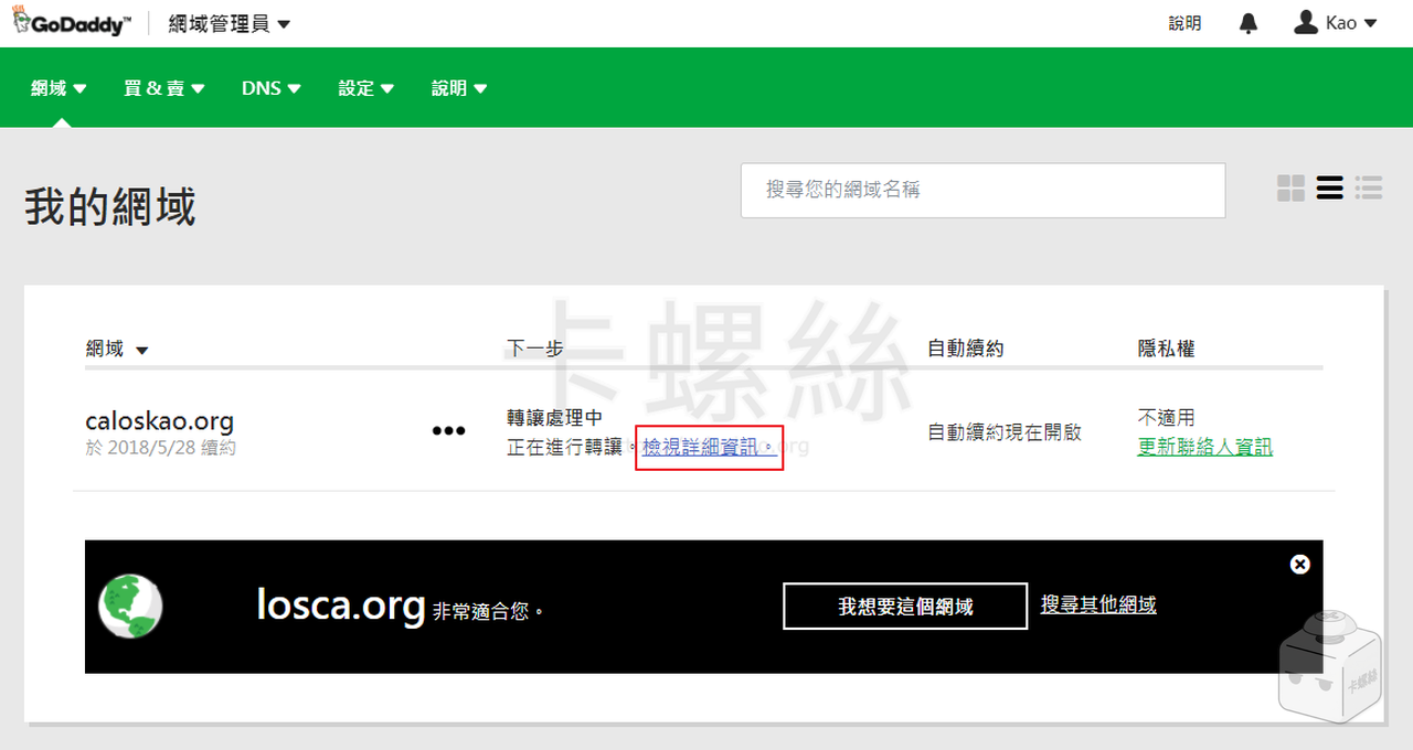接下來是加速轉移手續的操作,如果不想要等 5 天的話可以這樣做。回到 GoDaddy 的網域管理介面,點選「檢視詳細資訊」。