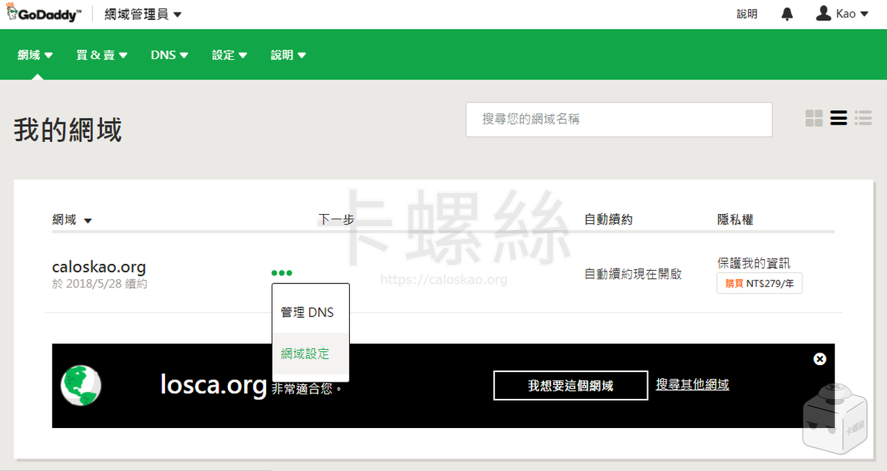 登入 GoDaddy 後,找到你要轉出的網域,點選「網域設定」