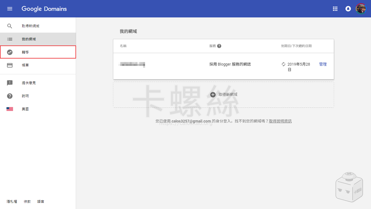結帳完成後會收到一封 Google Domain 的通知信,點選信中的連結後會開啟一份說明,直接捲到底,點選「轉移」。