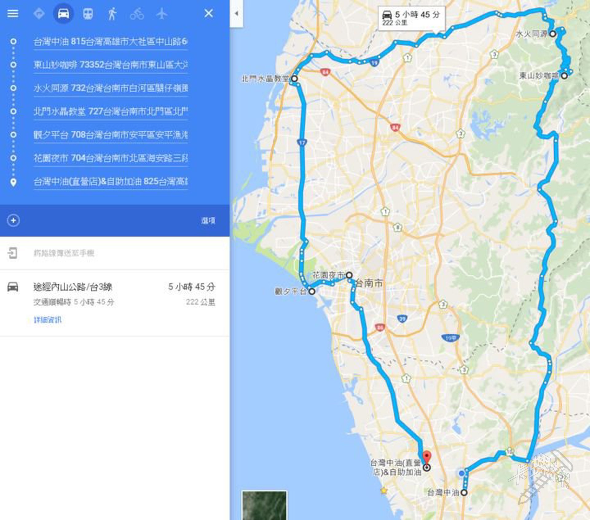 配合計算油耗,把起點和終點改成起訖加油站 (大社靖海站&橋頭站),以及移除三個沒有去的景點,總里程從 234 公里縮減為 222 公里外,路線上沒有太大的變化,只有台 61 改走台 17。