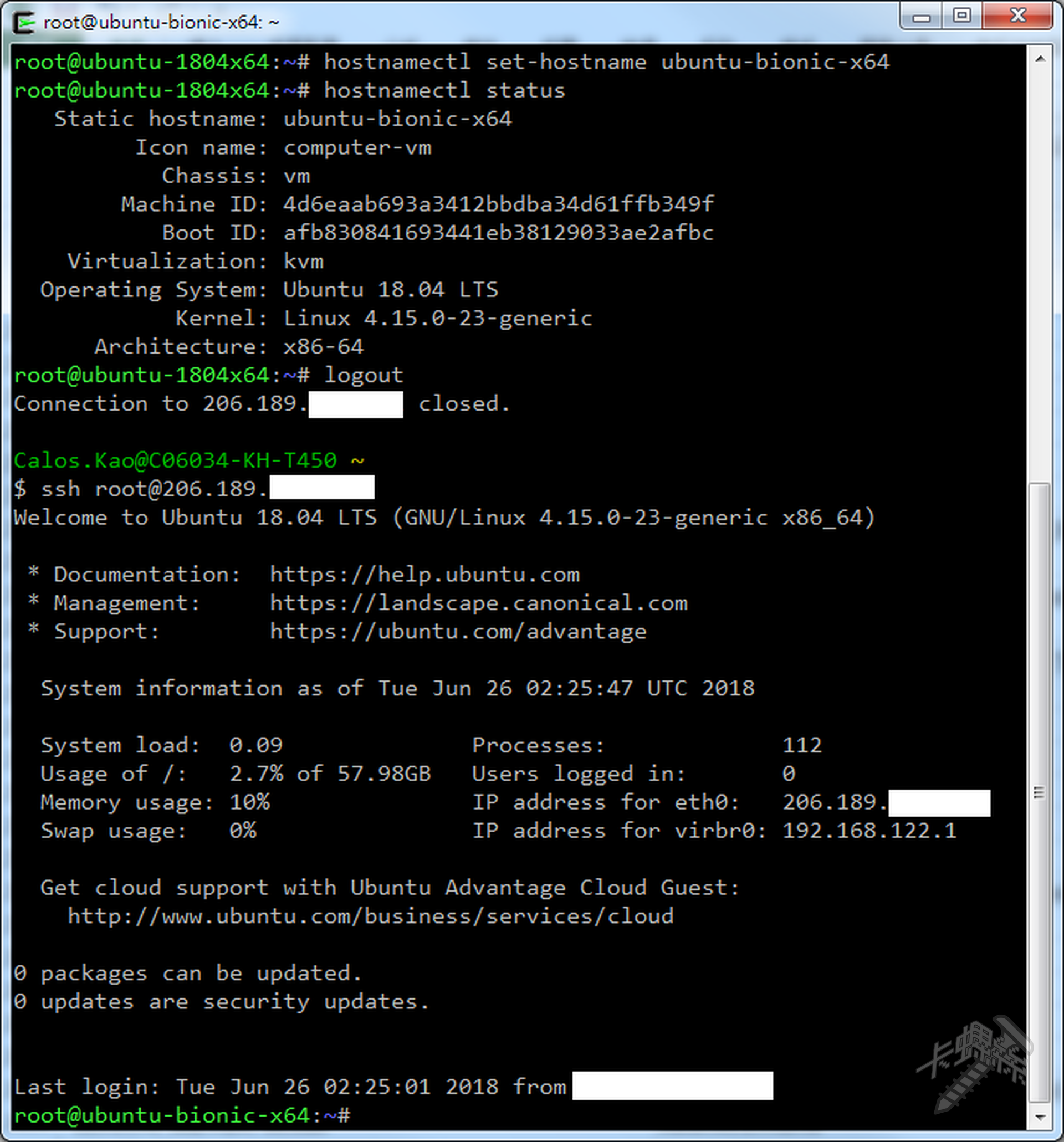 檢查結果是有修改過的,登出後重新登入主機就可以看到終端機的主機名稱修改成功,完整過程如下圖。