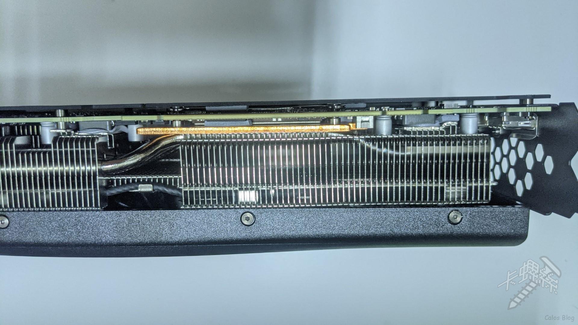 顯卡尾部,一共使用六根熱導管 散熱器正面有兩道凹溝,可增加散熱效率