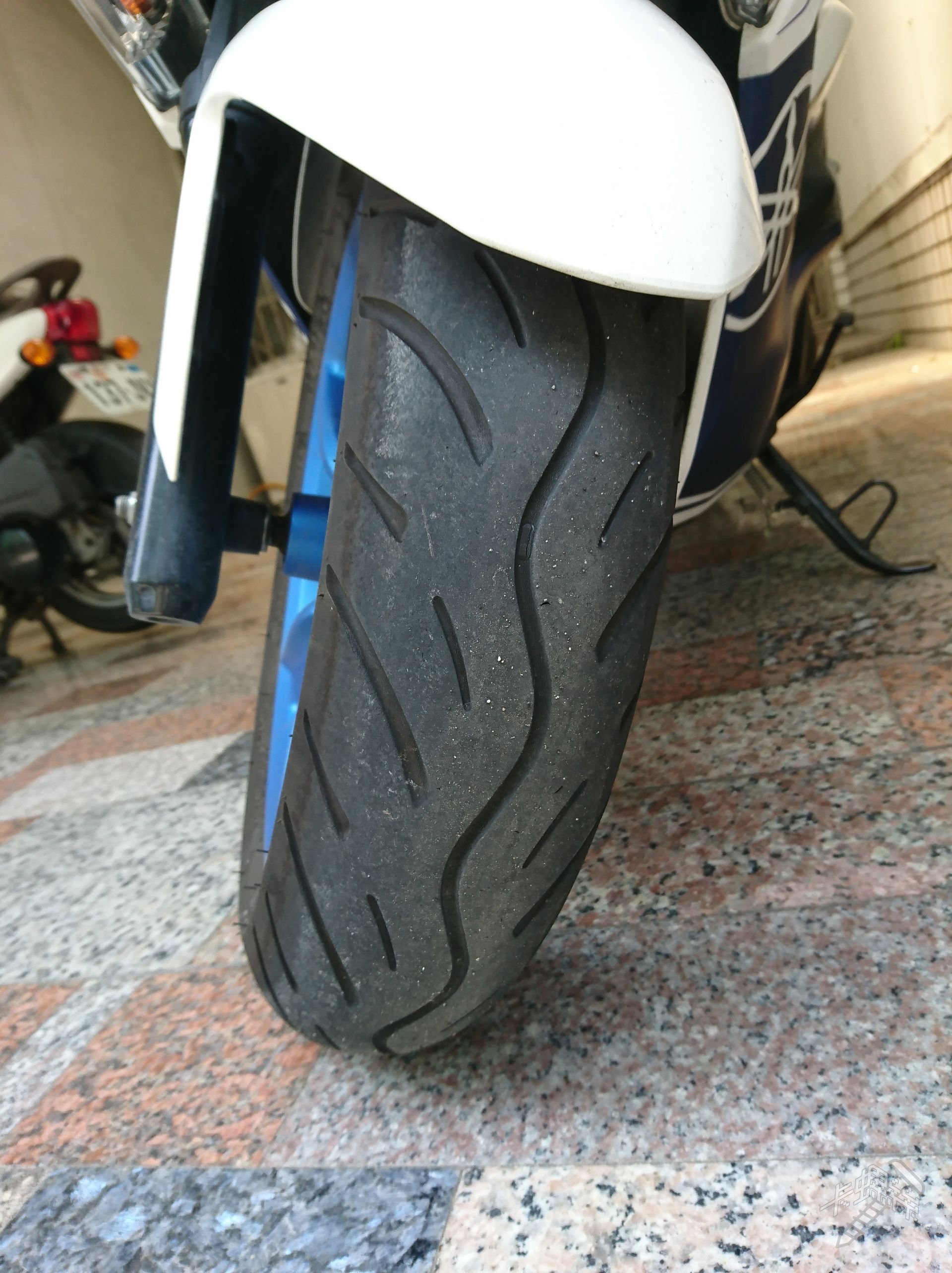 尚未更換,平常都順順騎,剎車片都還厚厚的,前後輪胎紋也都還夠